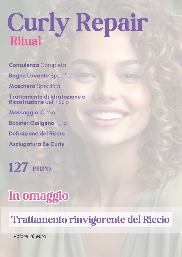 - Curly Repair Ritual- Questo rituale esclusivo mira a valorizzare la bellezza naturale del tuo riccio. - L’esperienza comprende una consulenza personalizzata durante la quale ti verrà spiegato che tipo di riccio hai e come gestirlo a casa in autonomia per avere risultati che siano quanto più possibili vicini a quelli che hai quando vieni da noi. Attraverso la tecnica del Facial Shape capiremo quale distribuzione di volumi attuare per valorizzare al massimo i tuoi lineamenti e l’ovale del tuo viso. La consulenza si chiuderà capendo quale sottotono di pelle hai e da che tonalità viene valorizzato. - Si procederà poi con un bagno lavante rigenerante applicato tramite un massaggio stimolante e rilassante, l’applicazione di una maschera rinvigorente anti crespo con effetto idratante o nutriente (in base alle esigenze del capello). A questo punto verrà poi applicato un trattamento che prevede l’uso di un composto ottenuto miscelando sostanze idratanti e rinvigorenti che ricostruiranno una struttura ottimale dei tuoi ricci. Dopodiché impiegheremo un booster di ossigeno su cute e lunghezze per rivitalizzare e stimolare la crescita di nuovi capelli forti e vitali. - Passeremo poi al taglio su misura con la nostra tecnica esclusiva che prevede l’uso di sole forbici e l’esecuzione su capello bagnato per ottenere la massima precisione e una lunga durata. Poi, attraverso l’applicazione di prodotti specifici in base al tipo di riccio, eseguiremo la definizione che garantirà ricci morbidi ed elastici. Termineremo con asciugatura naturale a diffusore che ci permetterà di mantenere elasticità, volume e idratazione. - PEFETTO SE VUOI OTTENERE UN EFFETTO RIPARATORE E RIVITALIZZANTE E RICOSTRUIRE LA STRUTTURA DEI TUOI RICCI. - RINVIGORIRLI E RITROVARNE ELASTICITÀ E DEFINIZIONE, MINIMIZZANDONE IL CRESPO.